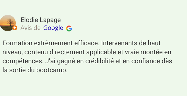 Après validation du paiement, vous recevez toutes les informations pratiques (dates, lieu, organisation) ainsi qu’un accès aux supports pédagogiques liés au bootcamp suivi.